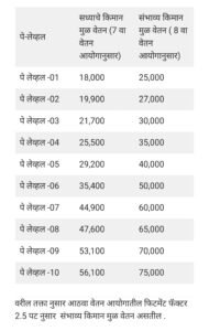 सुधारित संभाव्य वेतनस्तर : कर्मचारी संघटनांच्या मागणीनुसार किमान फिटमेंट फॅक्टर 2.00 पट तर कमाल 2.50 पट फिटमेंट फॅक्टर नुसार सुधारित वेतनस्तर निश्चित करण्याची मागणी करण्यात आलेली आहे . यांमध्ये 2.50 पट फिटमेंट फॅक्टरनुसार प्रस्तावित किमान मुळ वेतनाचा तक्ता पुढीलप्रमाणे पाहु शकता .