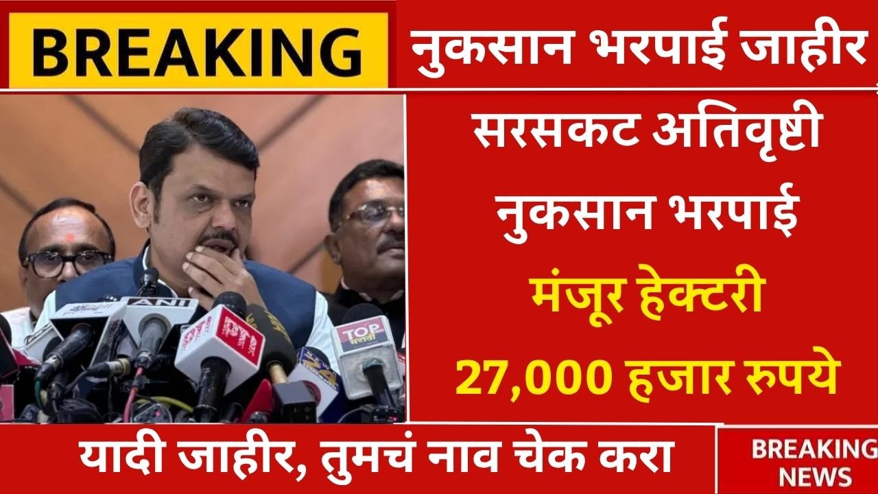 हेक्टर ₹ 27,000 इतकी सरसकट विक्रमी भरपाई “जिल्ह्यानुसार” यादीसोबत अधिकृतपणे प्रसिद्ध झालेली आहे — उदाहरणार्थ, एका संदर्भात असे सांगितले गेले आहे की “बागायती शेतीसाठी ₹ 27,000 प्रति हेक्टर” अशी मदत मंजूर झाली आहे.
