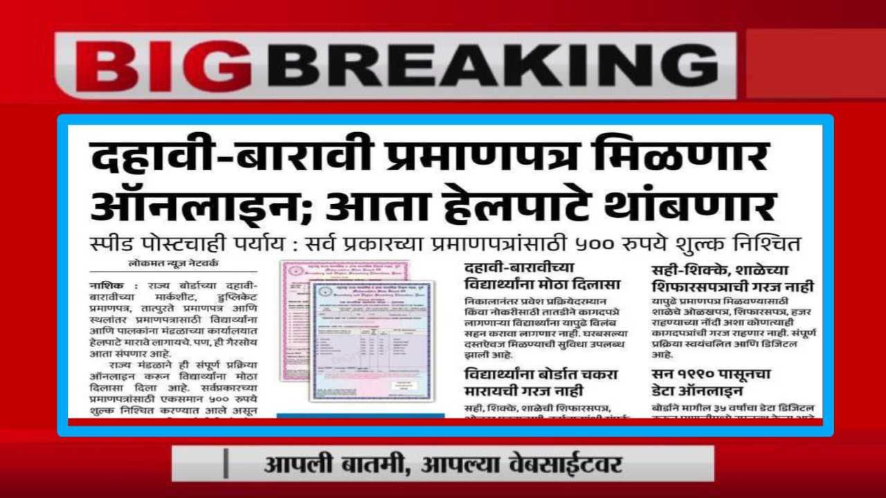 जर तुम्ही हरवलेले प्रमाणपत्र “lost / missing” म्हणून रीक्वेस्ट करत असाल — 2025 मध्ये MSBSHSE ने अधिसूचित केले की आता duplicate marksheet / certificate साठी ऑनलाइन फॉर्म भरता येईल. तसेच, ही सुविधा आता फक्ट (डुप्लिकेट) सर्टिफिकेट/मागतांसाठी लागू आहे.