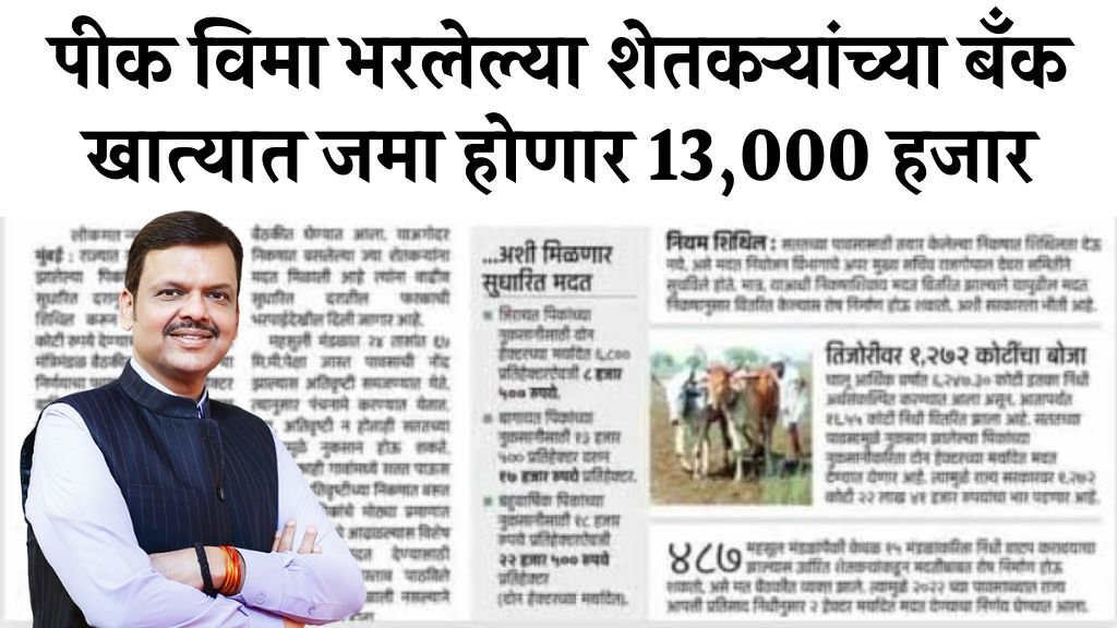 प्रधानमंत्री फसल बीमा योजना (PMFBY) किंवा राज्यस्तरीय पिक विमा योजनेअंतर्गत ₹13,000 इतकी रक्कम शेतकऱ्यांच्या बँक खात्यात जमा होणार असल्याची माहिती मिळते.