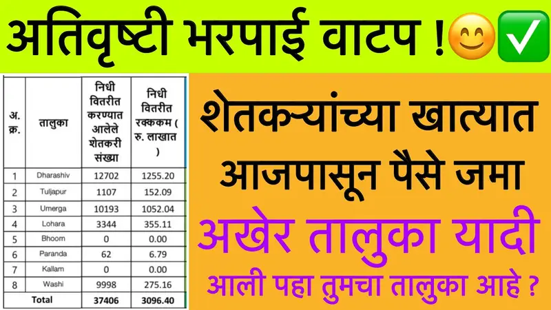 अतिवृष्टी (फ्लड / अधिक पाऊस) नुकसान भरपाई प्रक्रियेतील तालुक्यांचे (तालुका) यादी संदर्भात — आणि त्याबाबत जे माहित उपलब्ध आहे, ते खाली देत आहे: