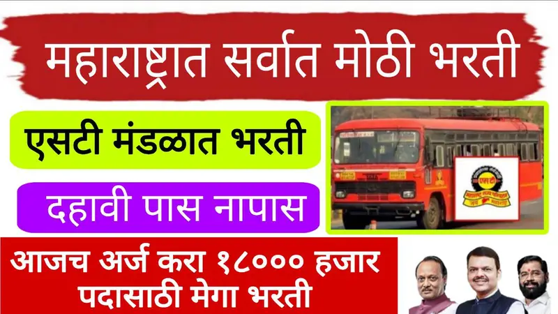 एका बातमीप्रमाणे, MSRTC मध्ये १७,४५० पदांसाठी कंत्राटी पद्धतीने भरती होणार आहे, ज्यात चालक व सहाय्यक (driver & assistant) पदांचा समावेश आहे.