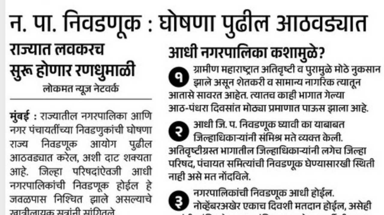 Nagar Palika | नगरपालिका निवडणूक घोषणा 6/7 नोव्हेंबर रोजी.