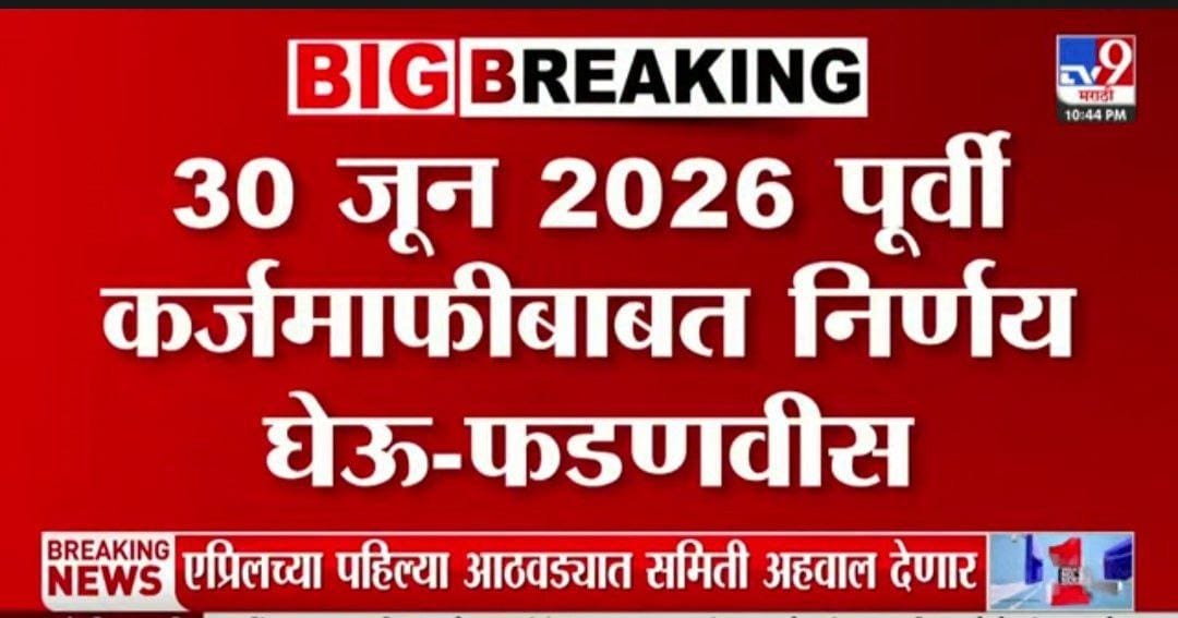 ✅ 30 जून 2026 पूर्वी कर्जमाफीचा निर्णय होणार आहे, म्हणजेच राज्य सरकार किंवा संबंधित प्राधिकरणाने त्या तारखेपर्यंत शेतकरी कर्जमाफीबाबत अंतिम निर्णय घेण्याचा संकल्प केला आहे.
