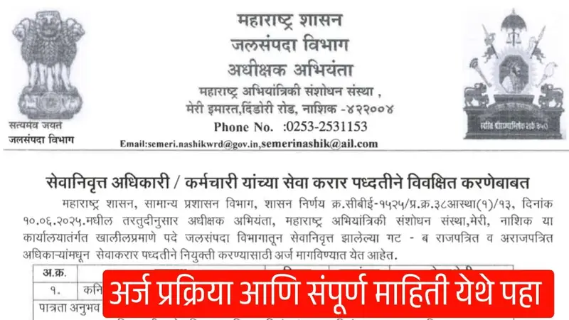 अर्ज पाठवायचा पत्ता: कार्यकारी अभियंता, स्थापत्य बांधकामे परिरक्षण विभाग, मेरी, नाशिक